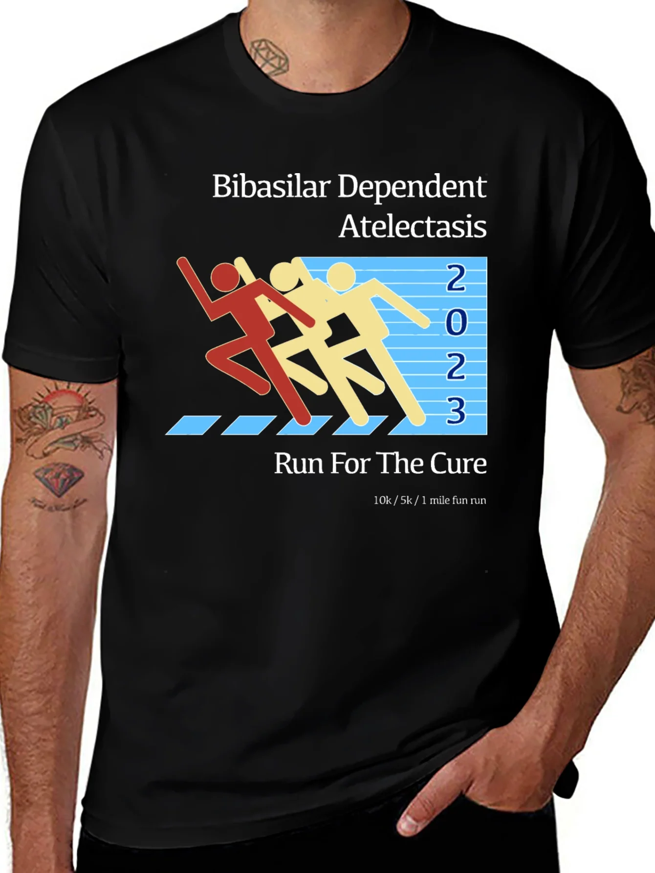 Esta camiseta negra de manga corta presenta un dise?o llamativo para la carrera ben¨¦fica "Run For The Cure" de 2023. El dise?o incluye figuras estilizadas de corredores en colores rojo y crema, sobre una pista azul. Se distingue por la leyenda "Bibasilar Dependent Atelectasis" en la parte superior y "Run For The Cure" debajo, destacando el prop¨®sito de la carrera. La leyenda "10k/5k/1 mile fun run" indica las opciones de distancia disponibles. Ideal para corredores, voluntarios o cualquier persona que desee apoyar esta causa ben¨¦fica con estilo y comodidad. Fabricada con materiales suaves y duraderos para uso diario o para entrenar.